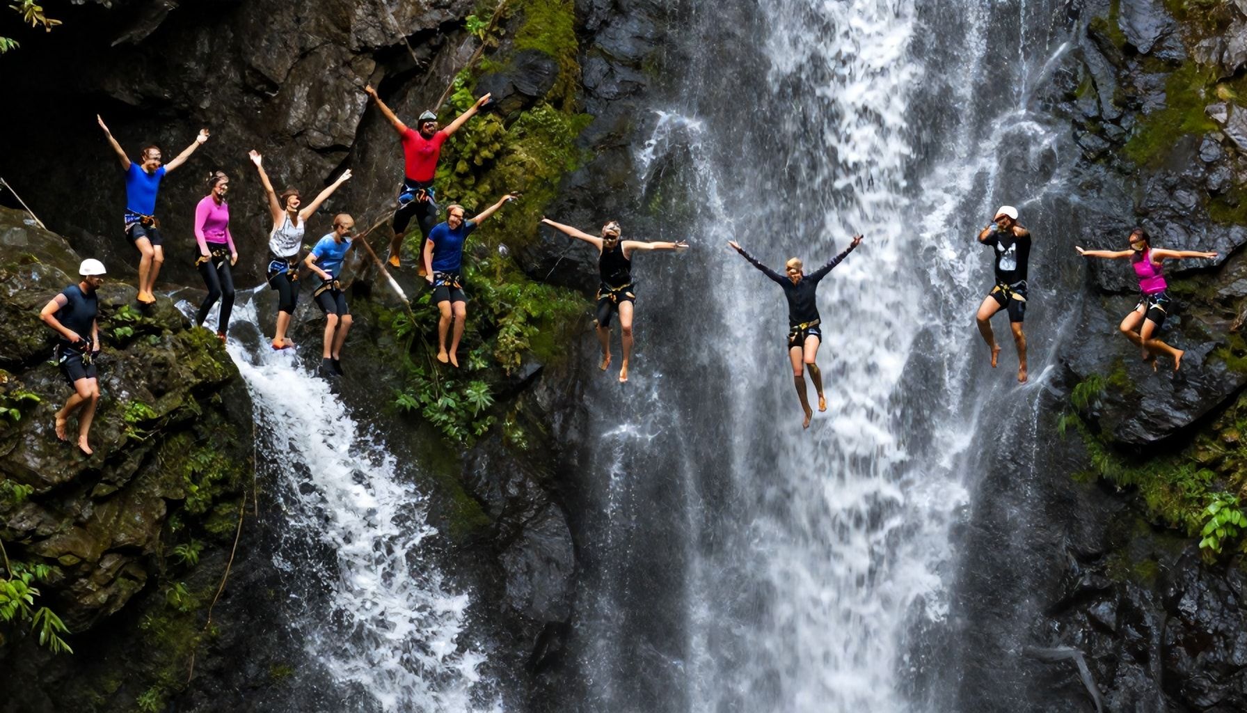 El salto del agua en cascada, también conocido como «canyoning» o «barranquismo», es una actividad de aventura que combina descenso de rápidos, saltos y rapel. Los participantes suelen equiparse con cascos, arneses y trajes de neopreno para protegerse de las condiciones extremas. Sin embargo, esta práctica conlleva riesgos significativos, especialmente cuando se realizan saltos de gran altura sin la preparación adecuada.