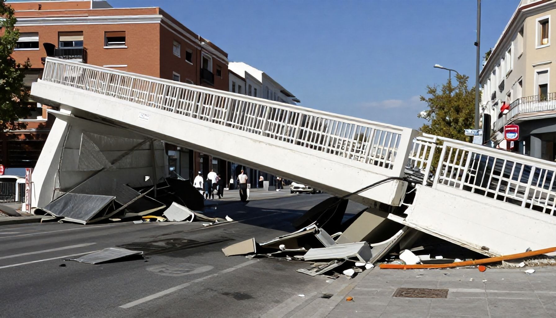 Un puente blanco de 15 metros de altura se desmorona en Madrid, causando un gran número de lesionados y un escenario de destrucción generalizada en la zona. El incidente ocurrió ayer por la tarde en la avenida principal de la ciudad, lo que ha llevado a una gran movilización de las autoridades y los servicios de emergencia.